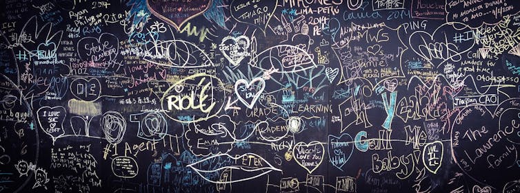 Derrière des actes considérés comme du vandalisme, telle est aussi la raison d’être existentielle des graffitis et des prénoms marqués sur les murs, sur les troncs d’arbre ou sur les bancs de l’école. Échos contemporains des dessins de mains sur les grottes préhistoriques – antichambre de l’écriture et de l’Histoire – on grave notre présence accompagnée ou non d’une intention au monde via un message de type sentimental (par exemple « Julien aime Sophie »), idéologique (par exemple un logo anarchiste), provocateur (avec une insulte), ou créatif (dessin ou poésie dans un moment d’évasion ou d’ennui).