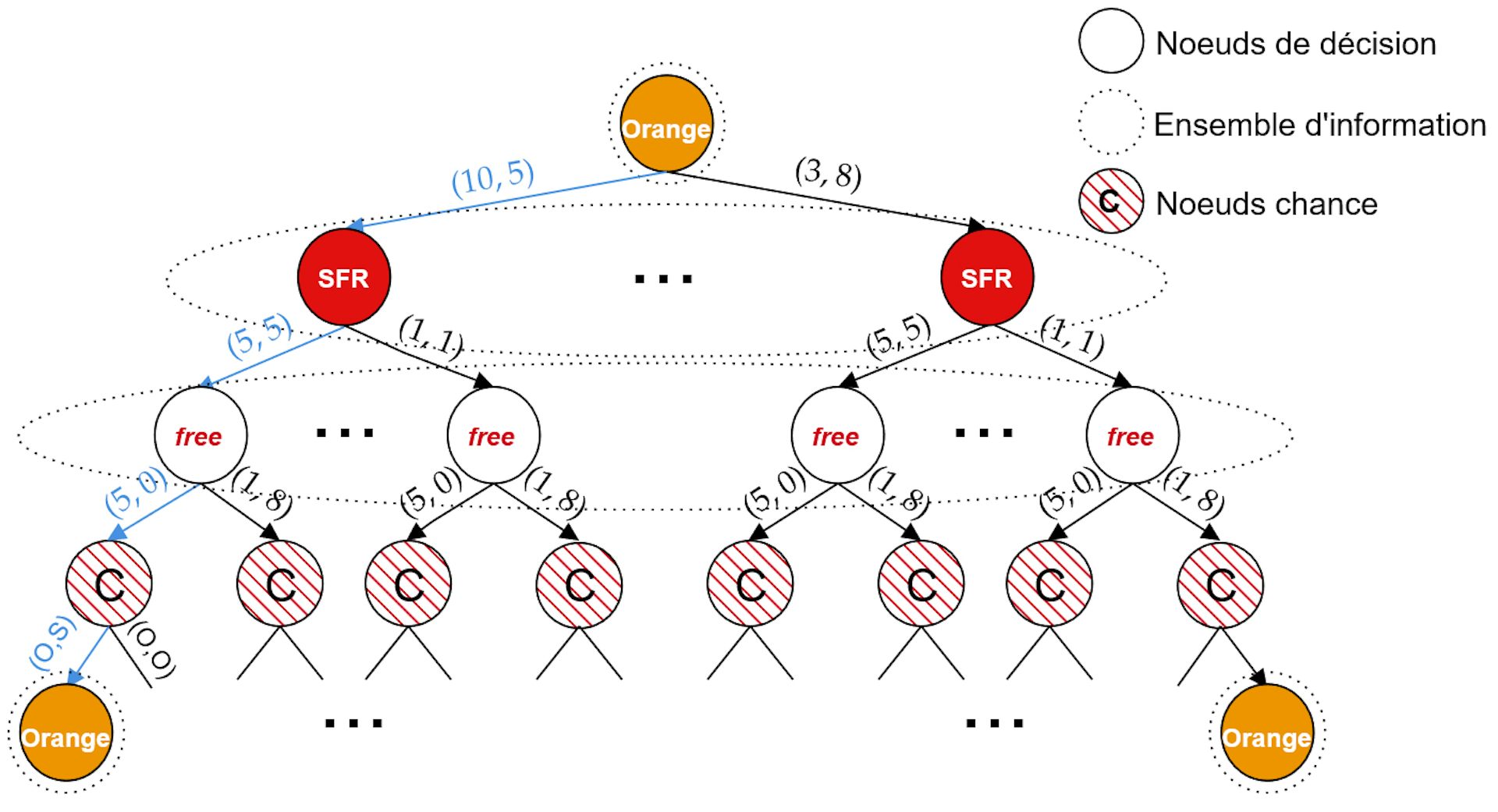 Pour modéliser cette incertitude, on utilise la notion d’ensemble d’information. Un tel ensemble regroupe des états potentiels dans lesquels se trouve l’enchère du point de vue d’un participant. Les « nœuds chance », quant à eux, représentent les tirages aléatoires en cas d’égalité des plus grandes offres soumises. Nous représentons ci-dessous un exemple d’arbre de décision entre trois opérateurs français.